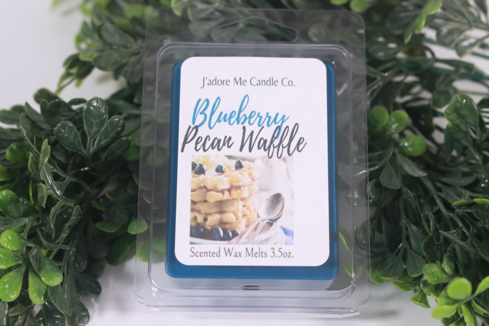 A mouthwatering medley of blueberries and maple syrup atop a stack of freshly made waffles.